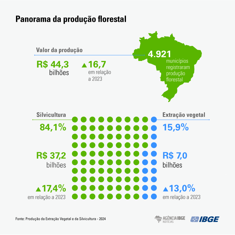 A produção florestal brasileira alcançou em 2024 o maior valor da série histórica, somando R$ 44,3 bilhões, um avanço de 16,7% em relação ao ano anterior, segundo dados divulgados pelo Instituto Brasileiro de Geografia e Estatísticas (IBGE). O crescimento foi puxado pela silvicultura (cultivo de florestas plantadas), que respondeu por 84,1% do total (R$ 37,2 bilhões), enquanto a extração vegetal atingiu R$ 7 bilhões.